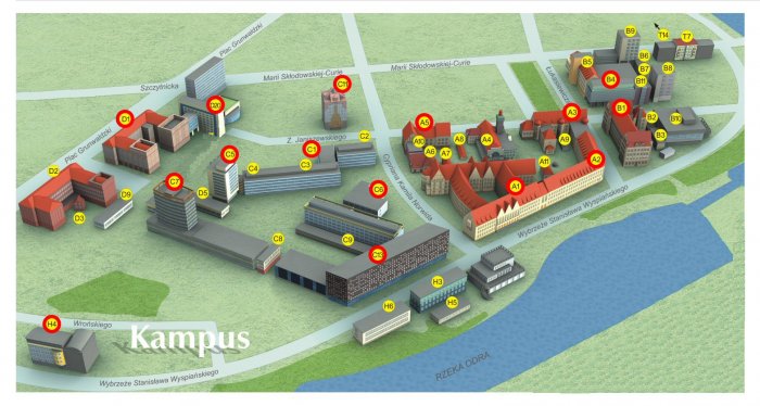 Na mapce Kampusu Głównego zaznaczono budynki (kolor żółty z czerwoną obwódką), w których znajdują się pojemniki na zużyte baterie i akumulatory małogabarytowe. Pojemniki są również umieszczone w następujących budynkach poza Kampusem Głównym: